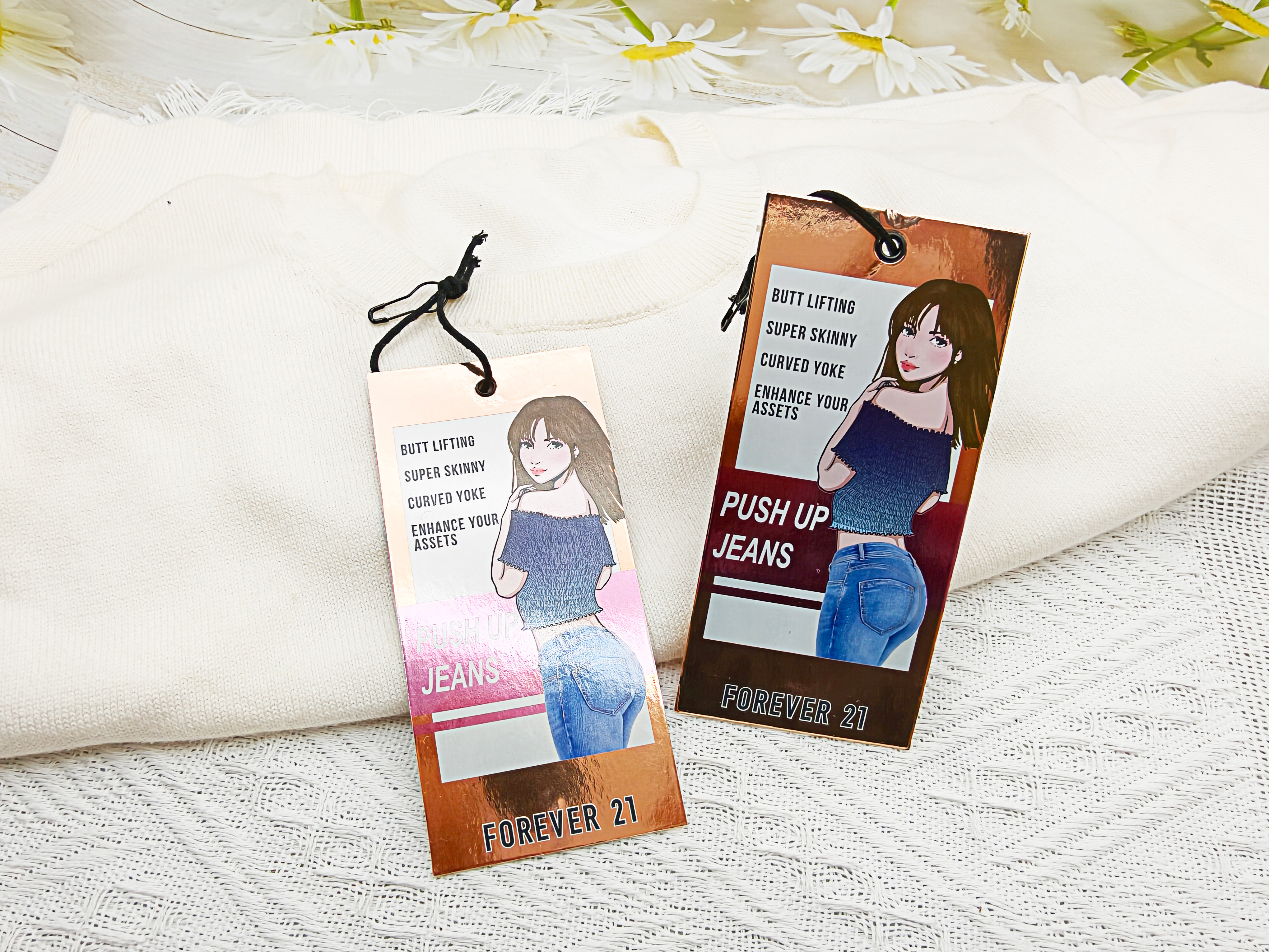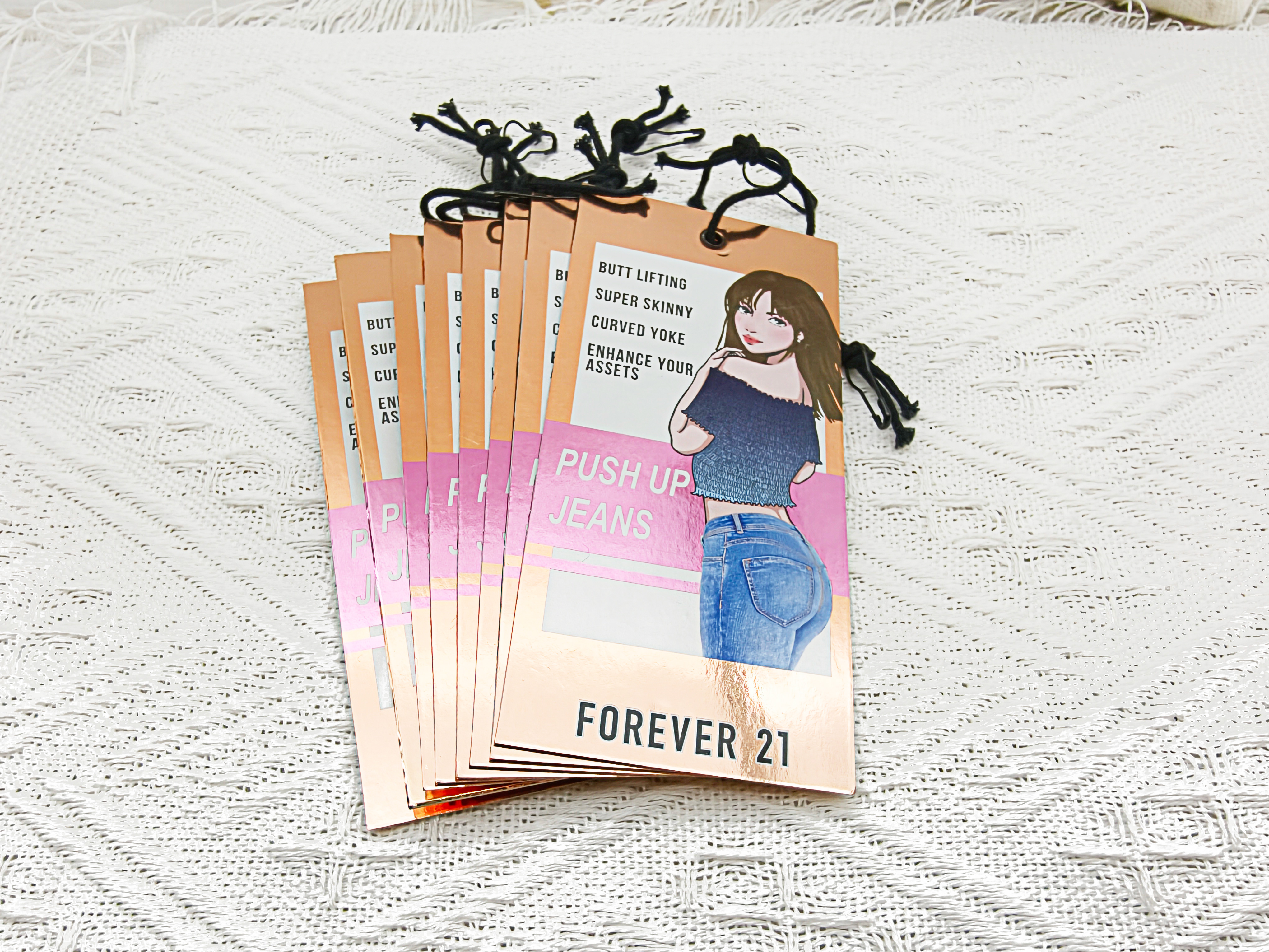 吊牌以粉白渐变为核心色彩基底,粉色温柔甜美,契合年轻女性的审美偏好,白色则让文字与插画更清晰易读;边缘的玫瑰金金属色作为点缀,中和了粉色的甜腻,增添了一丝酷感,形成 “甜而不腻、酷而不冷” 的视觉氛围。这种色彩搭配,精准呼应了 Forever 21 “甜酷兼具” 的穿搭风格,也与提臀牛仔裤 “展现柔美曲线又凸显利落线条” 的产品特质相匹配。