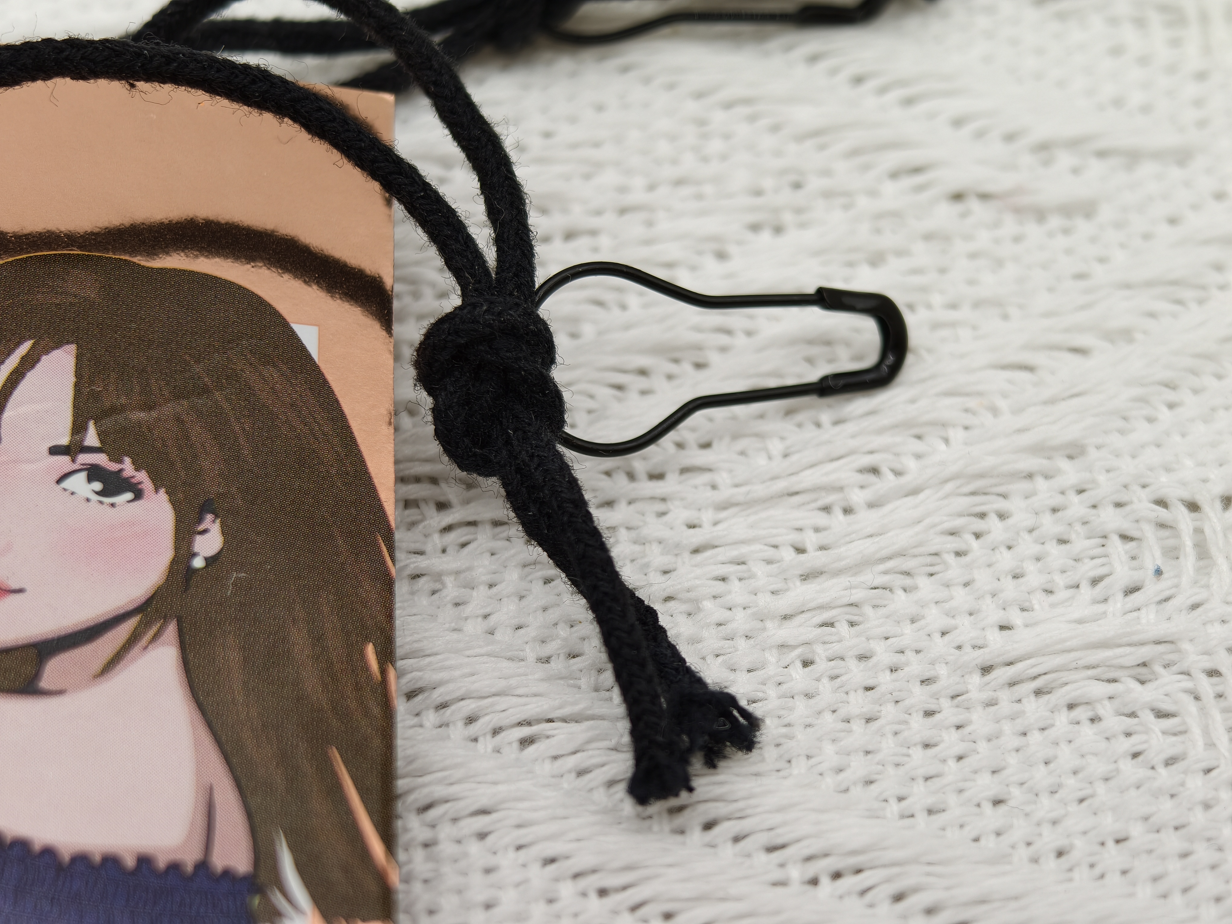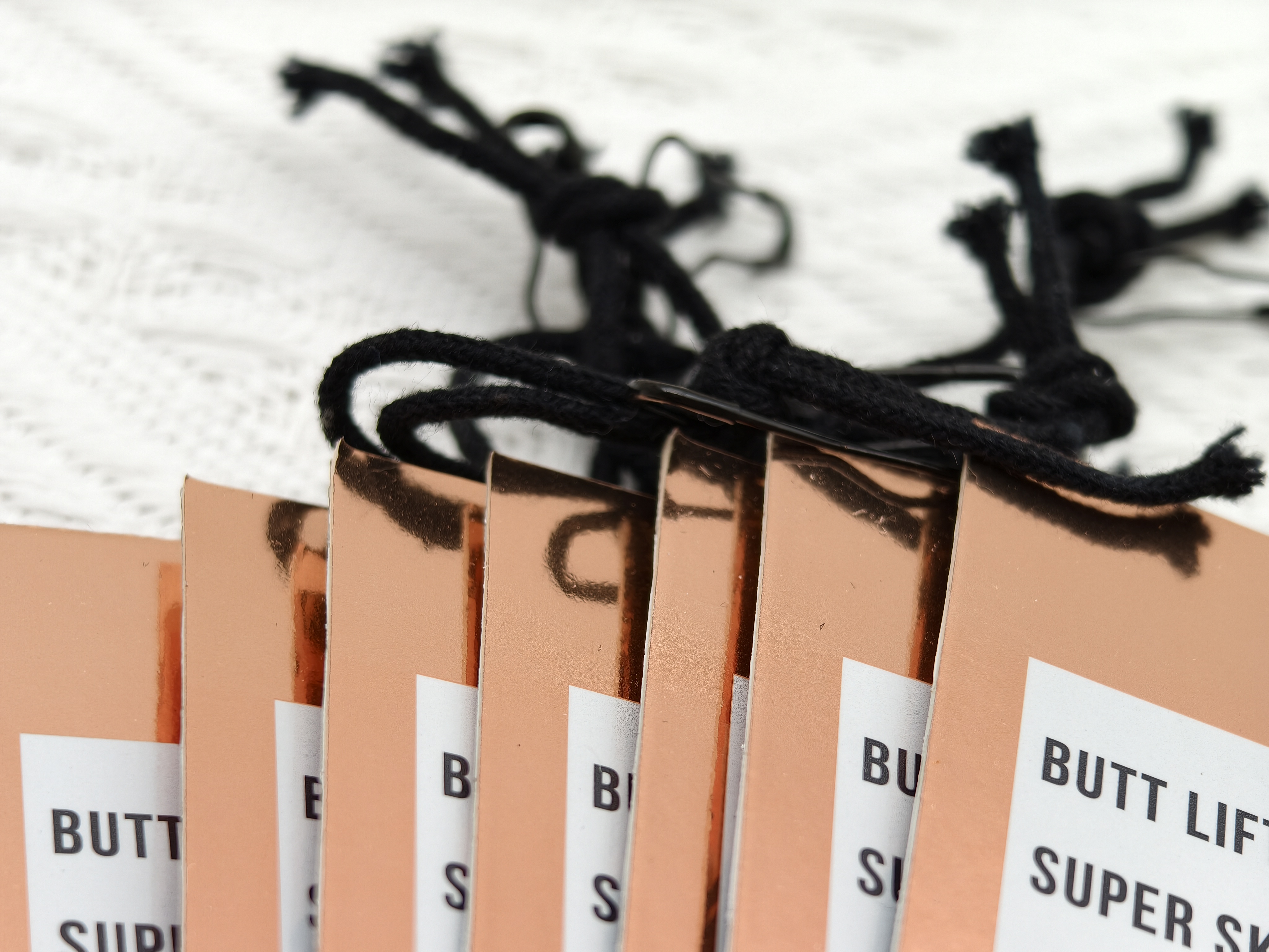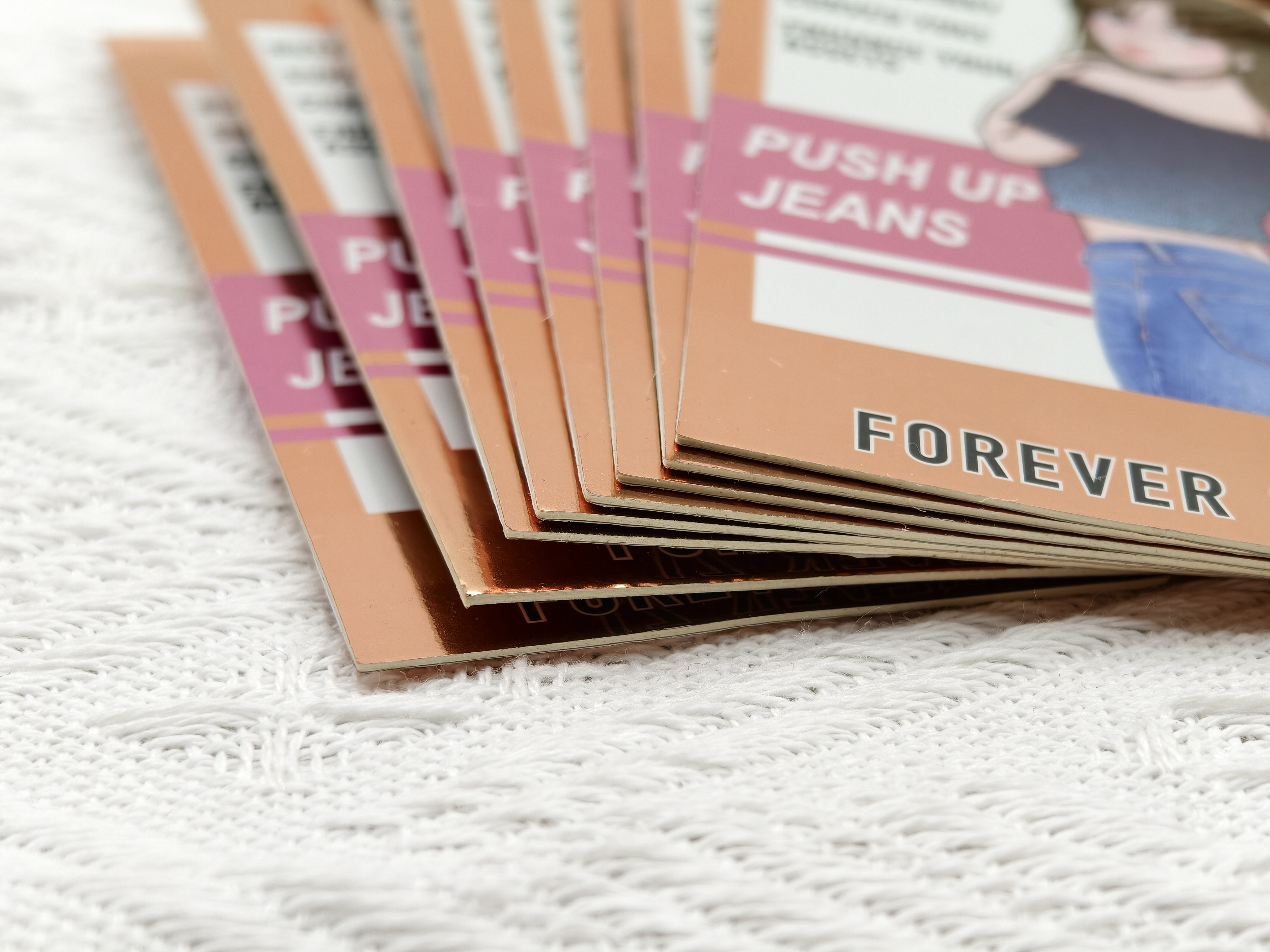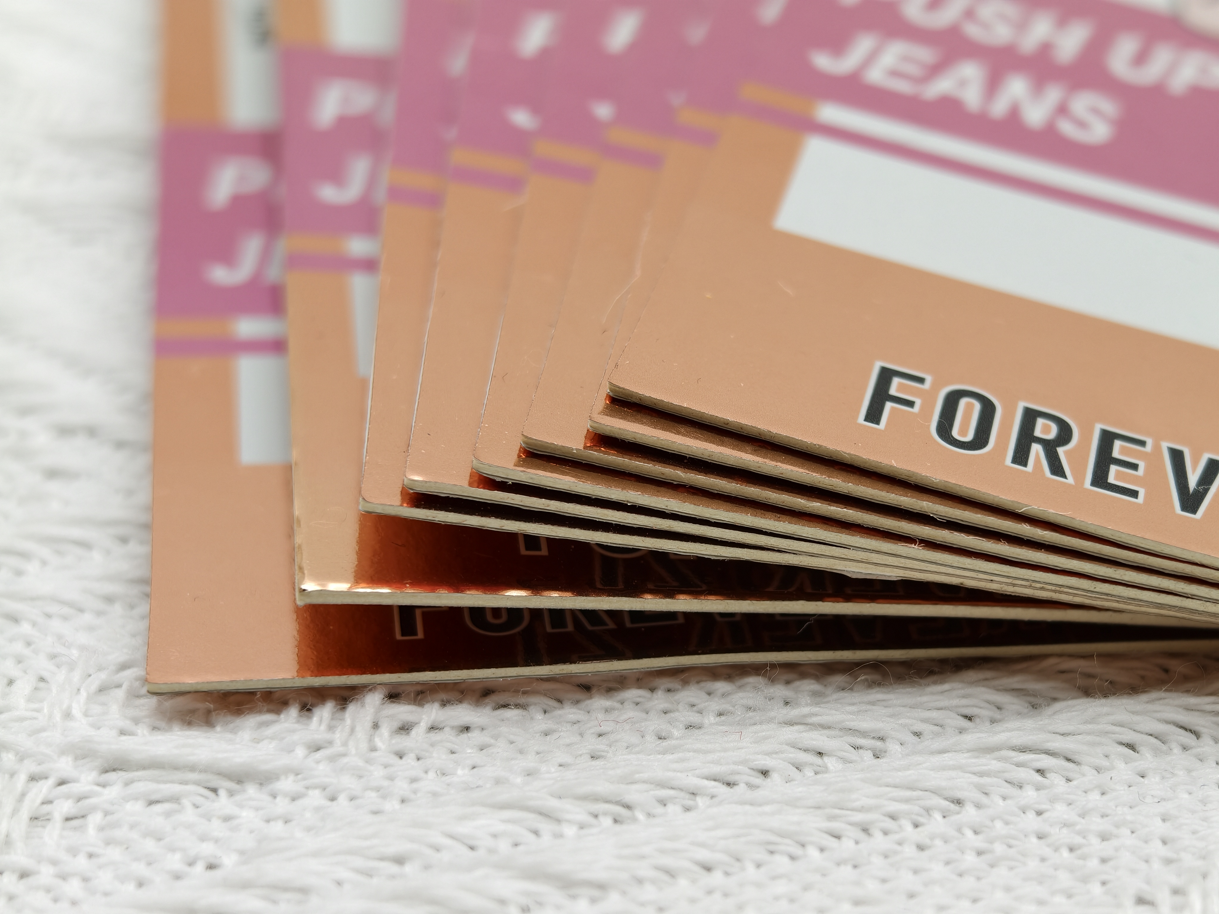 这组吊牌的材质选择,精准契合 Forever 21 面向年轻群体的定位。卡纸选用厚实的覆膜卡纸,表面带有细腻的珠光与金属质感,尤其是吊牌边缘的玫瑰金底色,在光线下泛着柔和的金属光泽,既提升了吊牌的挺括度,避免软塌变形,又通过金属质感赋予单品超越普通快时尚的精致感。搭配的黑色蜡线穿绳,绳结采用手工打结的随性样式,与美式街头的休闲风格呼应,同时蜡线耐磨不易断,兼顾实用性与视觉上的随性美感,让吊牌整体质感与牛仔裤的休闲属性形成平衡。